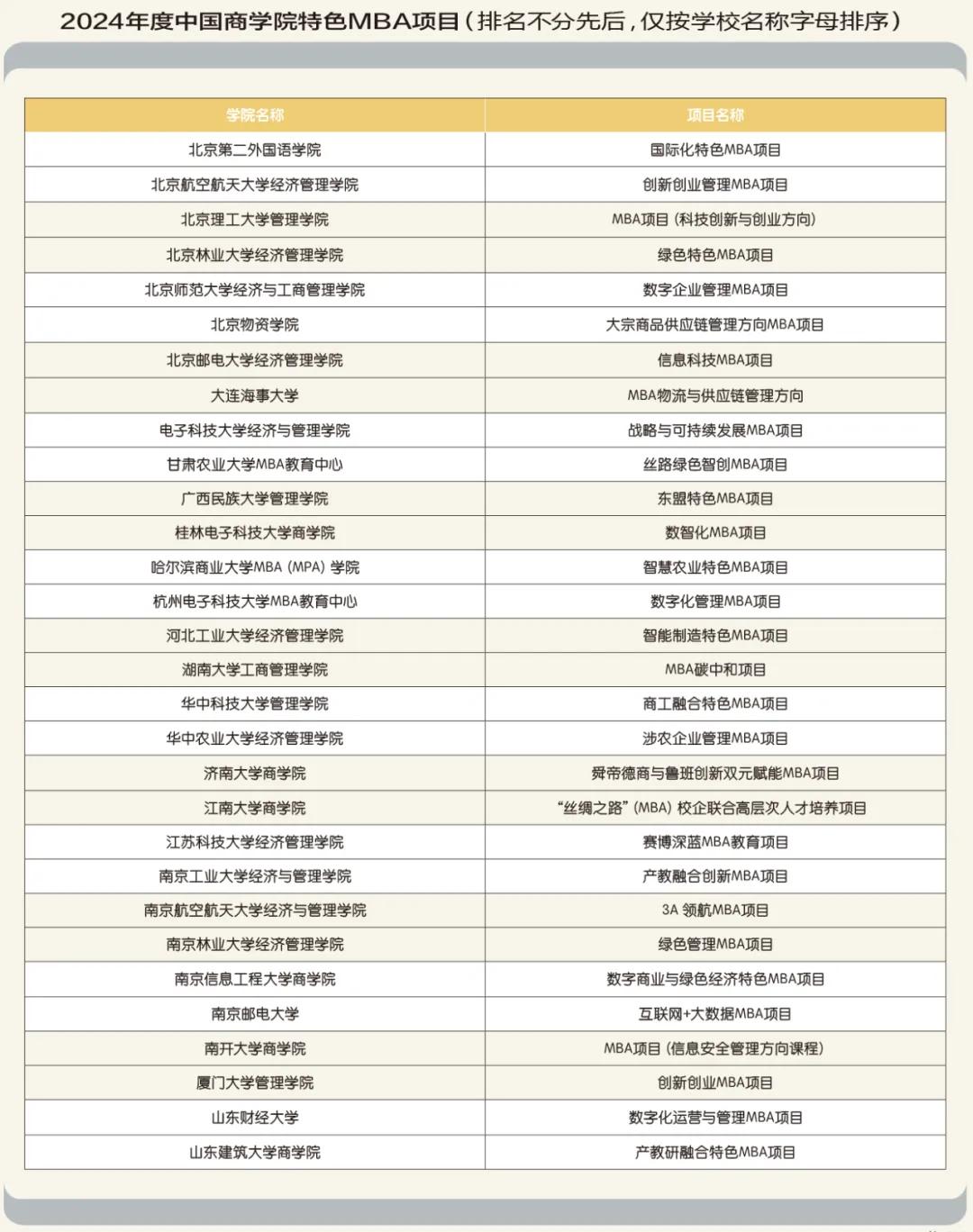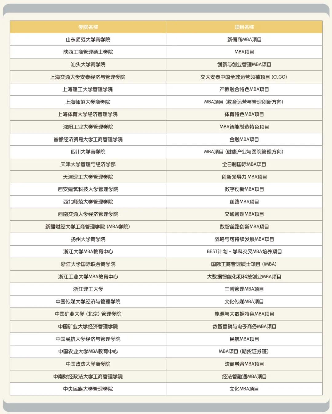 除了以上三个项目,还包括北京航空航天大学创新创业管理MBA项目、北京师范大学数字企业管理MBA项目、北京邮电大学信息科技MBA项目、华中科技大学管理学院商工融合特色MBA项目、中国传媒大学经济与管理学院文化传媒MBA项目、中南财经政法大学经法管融通MBA项目等优秀项目。